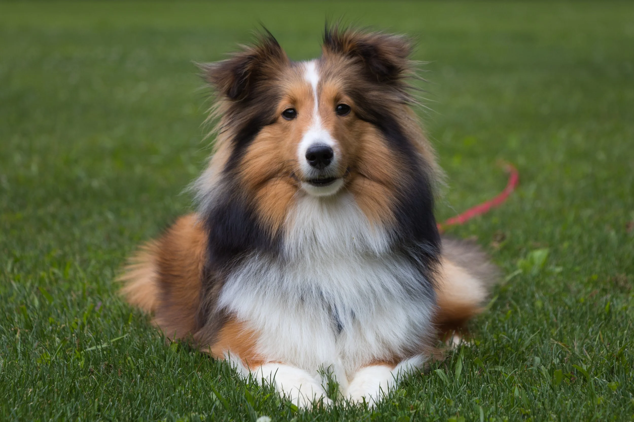 Shetland Sheepdog wearing a blue harness lying on grass next to a soccer ball.