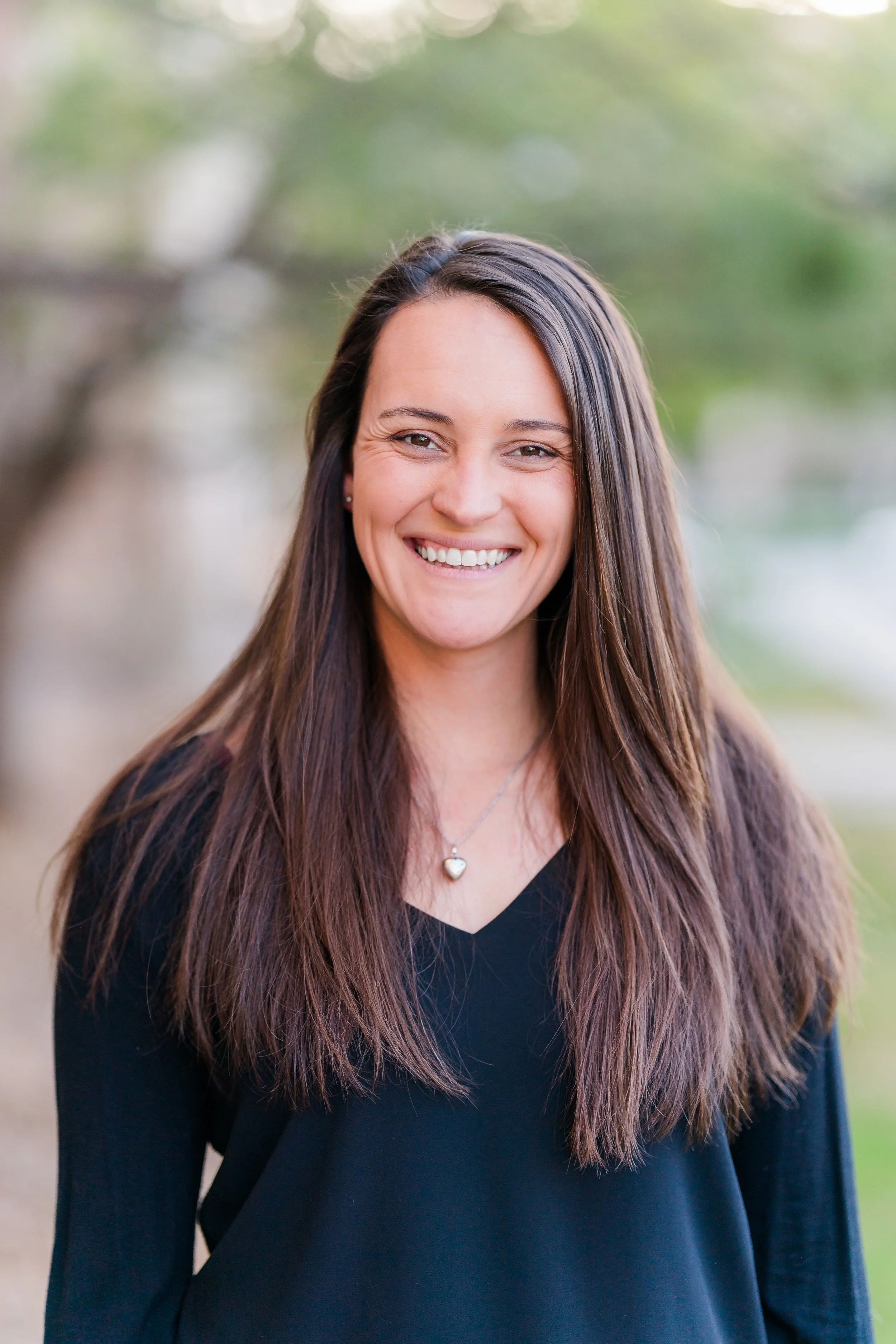 Smiling woman with long brown hair wearing a black top and heart necklace.