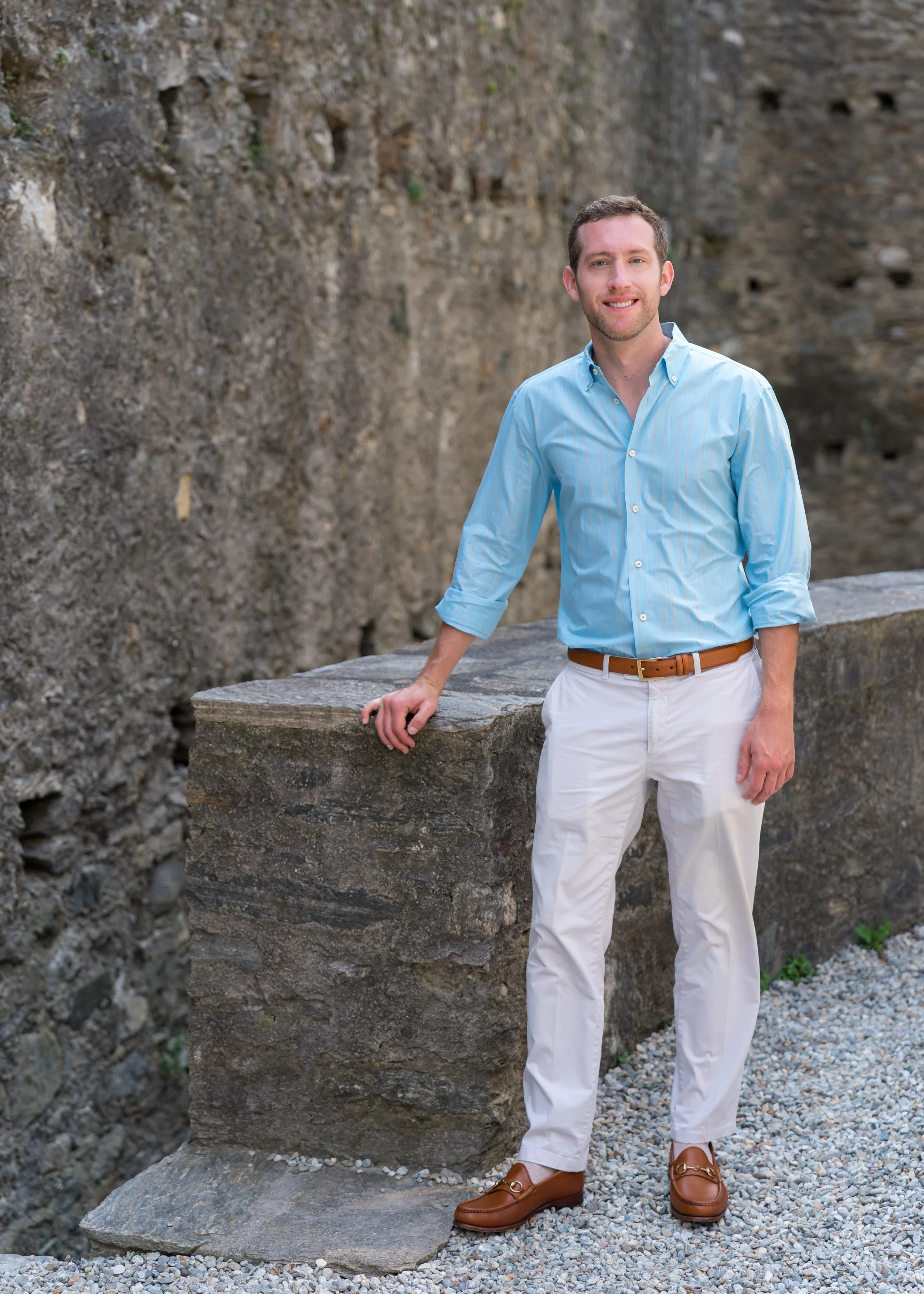 Young person wearing a cowboy hat, striped shirt, and jeans standing in a grassy field with blurred hills in the background.
